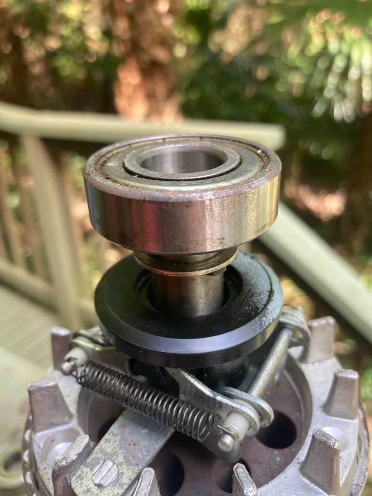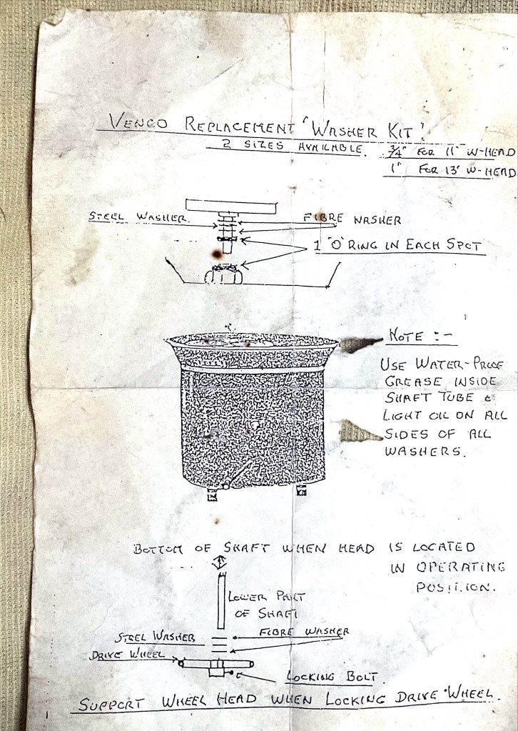 Undo the nut that hold the drivewheel to the shaft and wriggle it up until it comes off. When you turn the wheel back over the wheelhead should come straight out. Check around the top of the bearings and under wheelhead for any bits off stuff like old cutoff wire that may be stuck there. Clean off any lumps of caked on clay that might be causing a noise. Now check that all the ‘o’ rings, metal and fibre washers are in good condition. Refer to the above diagram for correct placement. These parts can be obtained from many suppliers such as Keanes or Walkers. Clean out old stiff grease and apply lots of new waterproof grease to all parts and re-assemble. When you flip the wheel over to replace the drivewheel you will need to put a block of wood or similar under the wheelhead to support it and prevent from slipping down. Check that the lower set of washers are in place and tighten the nut on the drivewheel. It is good to have a small amount of play, a couple of millimeters, between the end of the bearing housing and drivewheel so the wheel head is not too tight. The wheelhead should now turn freely with the motor off.