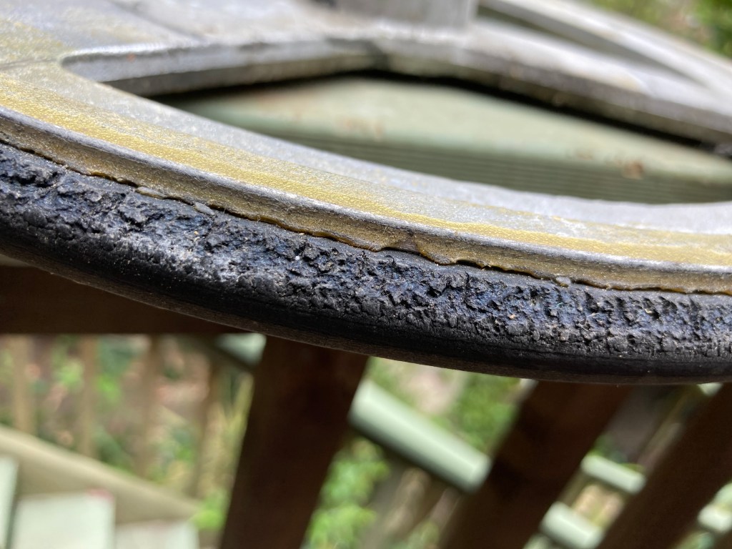 Two images showing a normal drive wheel (top pic) and a badly damaged one.(bottom photo) At the moment a new drive wheel will set you back around $250 plus installation if you choose not to do it yourself. It’s quite easy to do by the way. The main reason I see this sort of damage is because of missing grommets. You should never use a wheel that has missing grommets because it causes misalignment of the aluminum cone on the end of the motor shaft and it can dig into the rubber causing unrepairable damage. The drive wheels last between about 15 -30 years depending on usage and how the wheel is stored. I have seen some old models from the 80’s where the dive wheel is still usable but usually by this stage they start falling apart. The first sign of deterioration is small vertical cracks around the circumference of the wheel. If got to soon enough they can be reconditioned.