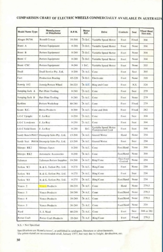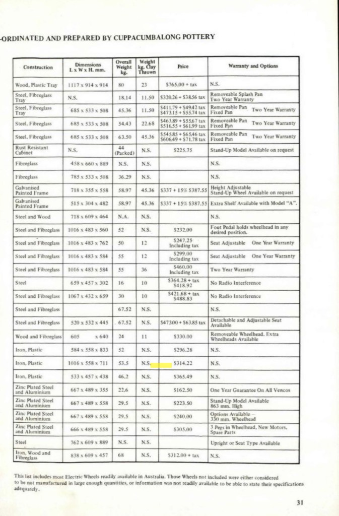 The following article was published in Pottery In Australia magazine Volume 16 No1 1977 by Doug Alexander. At the time of printing a Venco wheel costed around $225.
