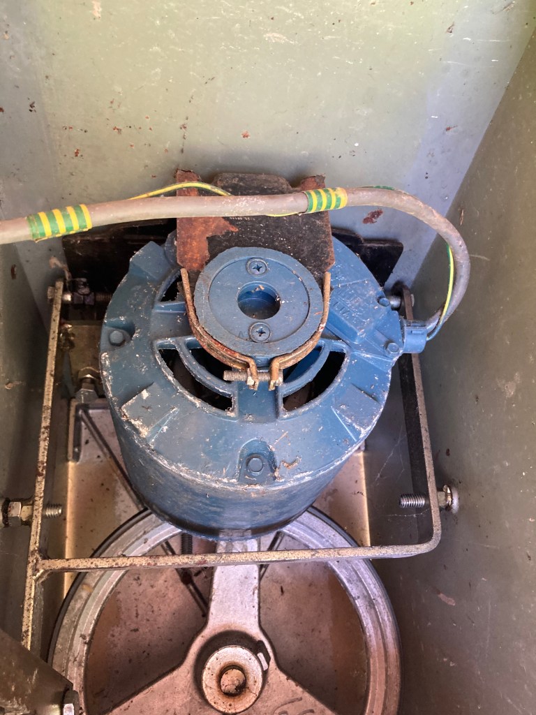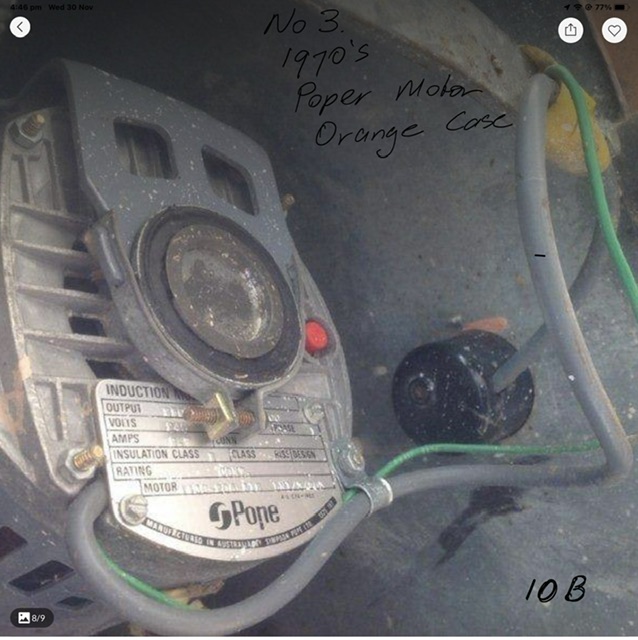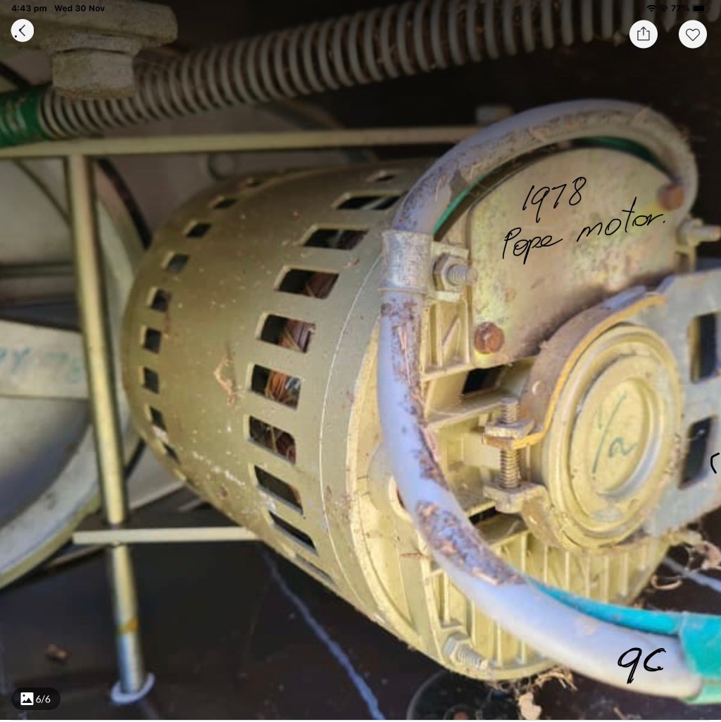 Pope motor with red overload button. The later motors don’t have this feature. It was a bit of a trap if you didn’t know it was there and you could have thought your motor had carked it when it was only the overload switch.