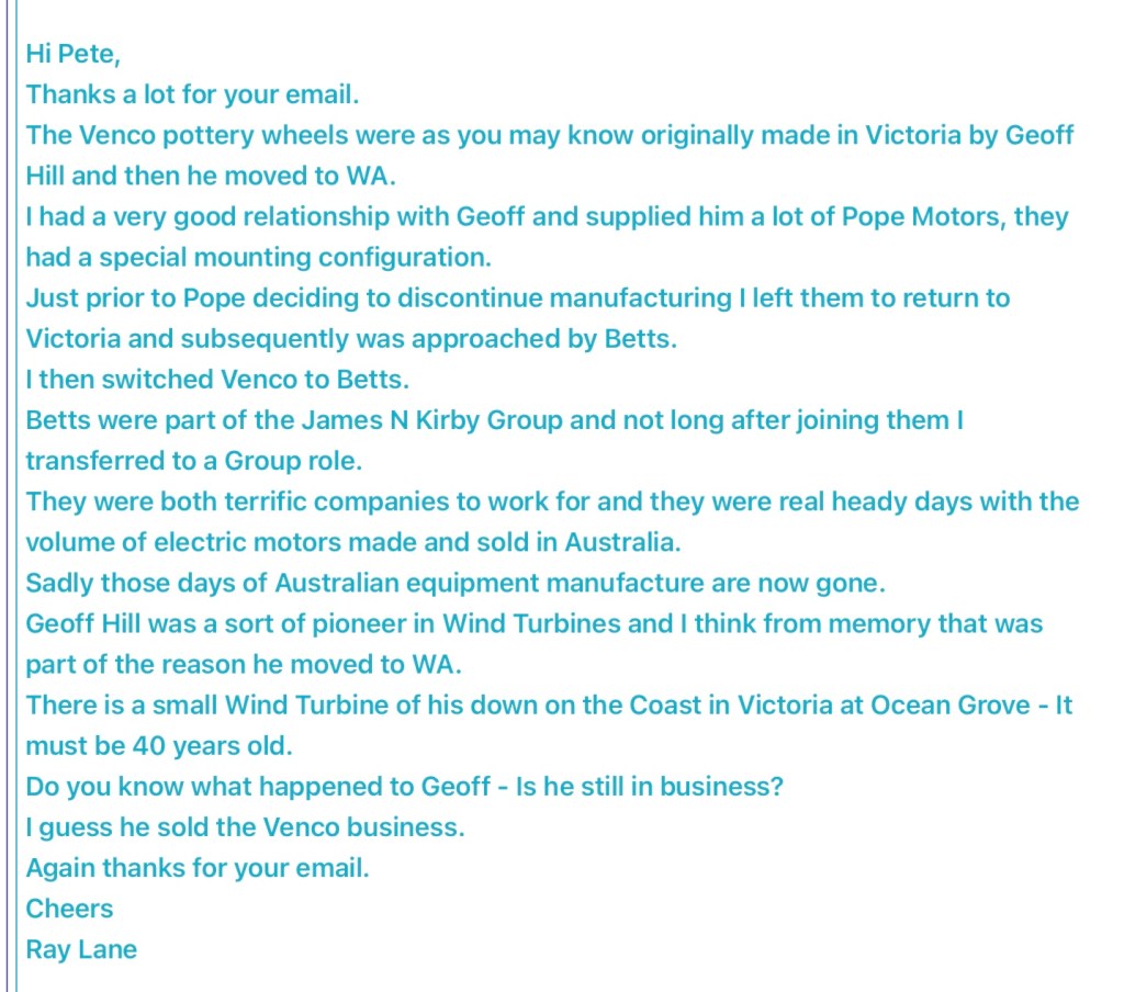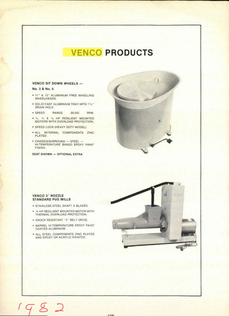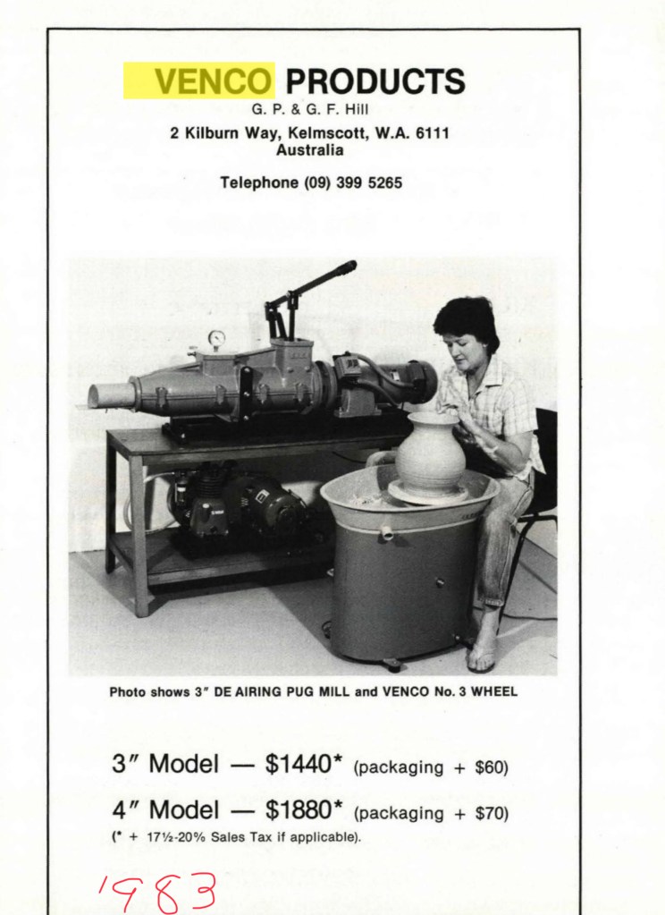 Venco began its manufacturing days in Melbourne when Geoff Hill started to make pottery wheels in his factory. He was also producing wind turbines at the time. I don’t know a lot about his early years but I have come across references to a Venco kick wheel being produced at first. As more information comes to hand I will update this story.