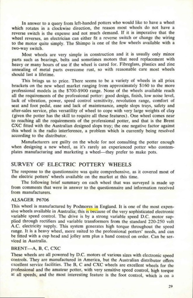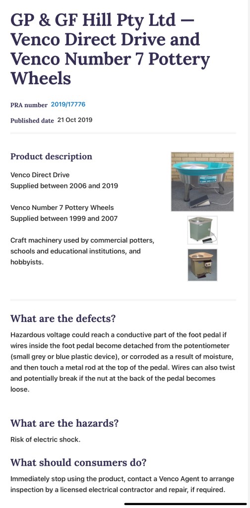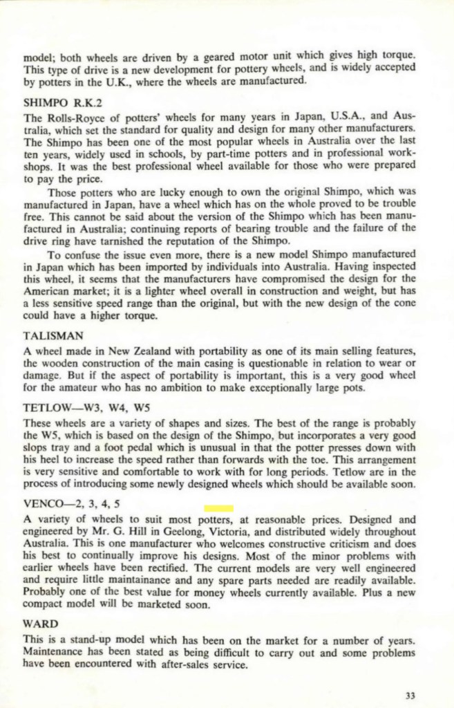 Ad from Pottery in Australia 1982 showing wheel with new design foot pedal. I purchased a new Venco wheel from a retailer in Lismore around this time. The wheel is now in the studio of my friend Daniel In Bonnells Bay.